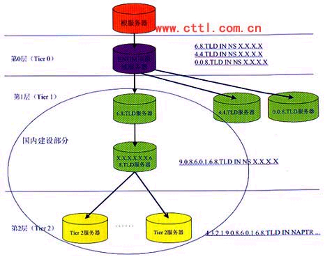 (1)第0層對(duì)應(yīng)于ENUM的根域,在這一層中只有一個(gè)域,比如e164.tld。第0層的域名服務(wù)器中包含的記錄指向ENUM第1層的域名服務(wù)器。