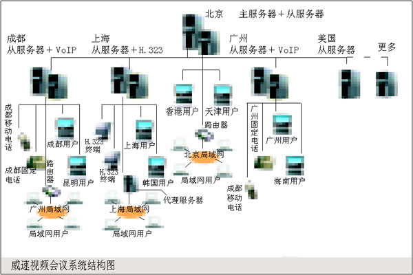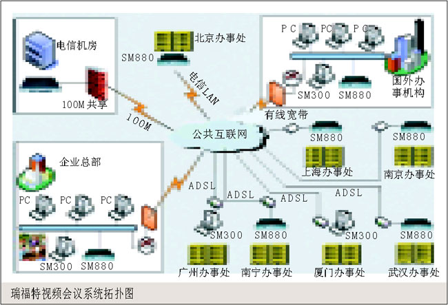 。。本系統(tǒng)中包含多個會場,使用瑞福特SM 880硬件終端,每個會場采用單獨(dú)的ADSL接入(也可采用其他接入方式),能夠保證發(fā)送與接收320×240、25