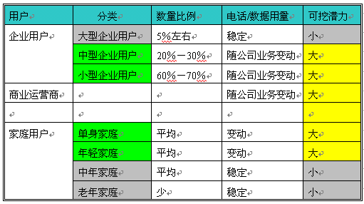 從以上表格可以清楚的顯示中小企業(yè)、商業(yè)運(yùn)營(yíng)商、年青用戶對(duì)電話和數(shù)據(jù)的使用不穩(wěn)定,這就意味者可發(fā)展、擴(kuò)大使用的可能性非常大,是企業(yè)增加收入的潛在用戶,但最主要的是如何提高這些用戶的使用呢?經(jīng)濟(jì)規(guī)律告訴我們?nèi)绻闾峁┑纳唐穼?duì)用戶有用,同時(shí)價(jià)廉、物美,用戶是不會(huì)拒絕的。對(duì)于電話運(yùn)營(yíng)商來(lái)講就是提供給企業(yè)帶來(lái)方便、效率、節(jié)省成本、方便管理的服務(wù)的同時(shí),提高有效接通率。