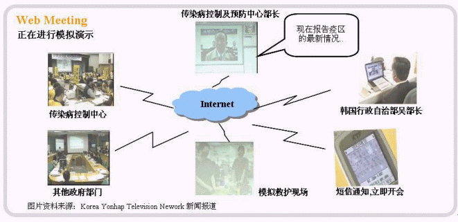 在韓國已經安排多次的模擬演示,當疫情在韓國發(fā)生及蔓延時,由韓國傳染病控制及預防中心發(fā)出開會通知,召集其他緊急醫(yī)療機構、專家及政府部門(如行政自治部)等,一起進行視像會議。在會議上,傳染病控制中心將各地收集回來的最新情況及報表共享給參會人及團體。由各專家一起分析現況,進行討論、判斷及決定解決辦法及措施。同時要求其他政府部門協(xié)調與全力幫助,目的是將疫情在最短的時間及在最少的范圍內得到控制及處理,減少對人民生命安全及國家損失的影響。先進的通訊科技能加快對危機發(fā)生時,政府相關部門及機構對事件的了解、分析、處理及決策,準確傳達信息、加強信息的交流、提高辦事效率、加快決策速度以及落實措施及處理方法的執(zhí)行。最重要的事,將各方面的損失降到最低的程度,避免了事情的惡化及波及其他范圍的負面影響。
