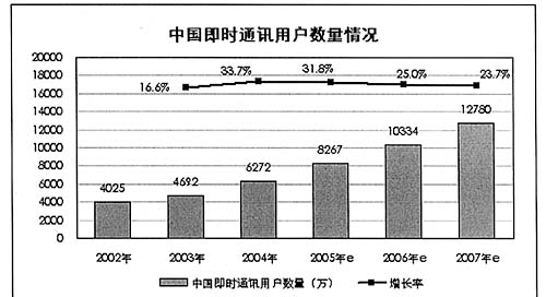 圖為:02年-07年中國(guó)即時(shí)通訊用戶(hù)數(shù)量及增長(zhǎng)率 來(lái)源:艾瑞咨詢(xún)