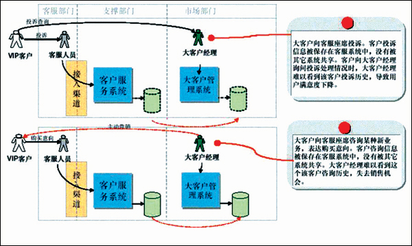 投訴的后臺處理流程分布在BOSS系統(tǒng)、1860客服中心、DSMP數(shù)據(jù)業(yè)務(wù)管理平臺以及OA多個業(yè)務(wù)支撐系統(tǒng)之中,系統(tǒng)之間相對獨立,同時投訴的交互數(shù)據(jù)分散在各個系統(tǒng)內(nèi),沒有一個完整、統(tǒng)一的客戶投訴資料,從而無法在不同的服務(wù)渠道中取得完整的客戶投訴信息,影響了客戶服務(wù)的質(zhì)量。當公司管理層需要了解某一項活動的開展情況或近期的投訴熱點、焦點問題時,操作人員只能采用傳真方式,臨時要求全省17地市、公司在一定時間內(nèi)上報,匯總后研究分析再行提交,使投訴熱點或焦點問題不能及時反饋給管理層。信息嚴重滯后,更談不上針對客戶投訴咨詢熱點問題進行數(shù)據(jù)挖掘,推出針對性的營銷策略。