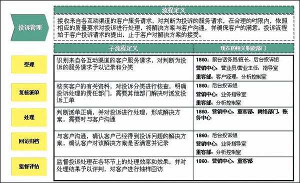 通過分析當前服務(wù)流程發(fā)現(xiàn)存在的問題,確立了以下需要進行針對性優(yōu)化的環(huán)節(jié): 適當授權(quán)加快高價值客戶投訴處理速度,體現(xiàn)差異化; 增加派單過程的透明性,使客戶更清楚地了解整個投訴的處理進程;