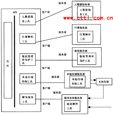 在DAVIC1.5AnytimeAnywhere文件中所規(guī)定的模型如圖2所示。在該圖中沒有描述任何與網(wǎng)絡(luò)相關(guān)的內(nèi)容。僅規(guī)定出在客戶端設(shè)備和服務(wù)器端設(shè)備中應(yīng)當(dāng)包含的功能模塊。即:元數(shù)據(jù)服務(wù)、位置解析、版權(quán)管理和保護(hù)、本地存儲(chǔ)控制、媒體服務(wù)。其基本思想為,在服務(wù)器端提供的所有功能。在客戶端設(shè)備中應(yīng)包含有相關(guān)的軟件工具。在業(yè)務(wù)的具體實(shí)施過程中,客戶端首先向服務(wù)器端請求幫助查找其感興趣的媒體內(nèi)容,由元數(shù)據(jù)服務(wù)器處理并返回相關(guān)信息。通過位置解析服務(wù)器來確定客戶端所選擇的媒體內(nèi)容所在的位置;經(jīng)過媒體管理和保護(hù)服務(wù)器的認(rèn)可:由本地存儲(chǔ)服務(wù)器向用戶提供媒體信息同時(shí)允許客戶端對媒體信息進(jìn)行控制。