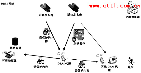 如圖4所示,DRM系統(tǒng)主要負(fù)責(zé)將內(nèi)容發(fā)布者發(fā)布的信息與版權(quán)發(fā)布者發(fā)布的信息組合起來將內(nèi)容變?yōu)槭鼙Wo(hù)的內(nèi)容,由版權(quán)客體提供使用規(guī)則,用戶在使用內(nèi)容時(shí)需要首先從DRM代理處根據(jù)使用規(guī)則獲得使用受保護(hù)內(nèi)容的密鑰,然后使用所獲得的密鑰對受保護(hù)的內(nèi)容進(jìn)行解碼并使用。