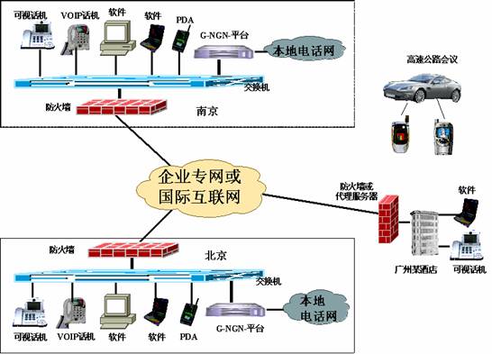 G-NGN-Softswitch產(chǎn)品可以使集團(tuán)用戶通過租用網(wǎng)絡(luò)運營商的寬帶線路,或者直接借助國際互聯(lián)網(wǎng)組建成連接全市、全省乃至全國的集團(tuán)內(nèi)部網(wǎng)絡(luò)電話,可以提供可視話機(jī)、非可視話機(jī)、客戶端軟件、PDA等多種便捷方式實現(xiàn)集團(tuán)內(nèi)部的可視或非可視通訊。