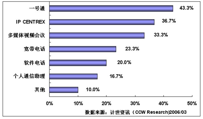 通過計(jì)世資訊(CCW Research)的調(diào)研可以看到,行業(yè)用戶對一號通、IP-CENTREX、多媒體視頻會議和寬帶電話等基于NGN平臺開發(fā)的業(yè)務(wù)比較感興趣,其中:對一號通感興趣的用戶達(dá)到43.3%,對IP-CENTREX感興趣的用戶為36.7%,對多媒體視頻會議感興趣的用戶達(dá)到33.3%,對寬帶電話感興趣的用戶達(dá)到23.3%,對軟件電話感興趣的用戶達(dá)到20.0%,對個(gè)人通信助理感興趣的用戶達(dá)到16.7%。