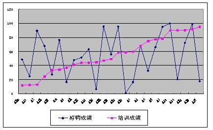 相反,如果培訓成績和工作績效的關系如圖5,從中我們可以看出,培訓的成績和招聘的成績表現出很強的正相關,說明培訓成績好的人,其工作績效相應好,培訓成績差的人,其工作績效也差,說明培訓是有效的。