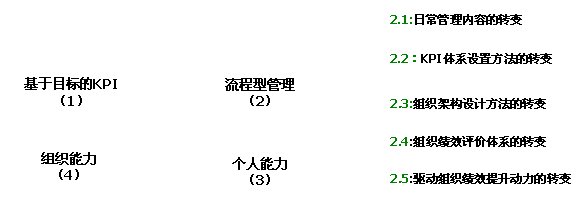 如圖1中的第(1)部分所示,客戶服務(wù)中心原來的管理是基于目標(biāo)KPI的管理,為了有效實(shí)施“流程型”管理,必須將其轉(zhuǎn)變“流程型”管理的組織,即必須將原來基于目標(biāo)的KPI管理轉(zhuǎn)變?yōu)榛诹鞒痰腒PI管理和流程(過程)管理(如圖1中的第(2)部分所示)。同時(shí),通過對(duì)員工培訓(xùn)組織所具有的一流的流程,使員工按照流程能力產(chǎn)生一流的績(jī)效,實(shí)現(xiàn)組織向員工的能力傳遞,有效提高每個(gè)員工的個(gè)體能力(如圖1中的第(3)部分所示);通過統(tǒng)一規(guī)范的流程保證個(gè)體行為的一致性,從而保證組織的能力,從而推動(dòng)整個(gè)團(tuán)隊(duì)組織能力的提升(如圖1中的第(4)部分所示),最終通過組織能力保證組織目標(biāo)績(jī)效的實(shí)現(xiàn)(如圖1中的第(1)部分所示)。