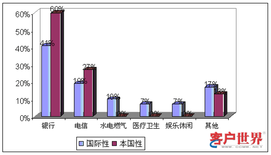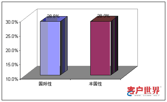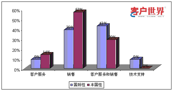 從業(yè)務(wù)功能看來,國際性呼叫中心和本國性呼叫中心承擔(dān)著不同的角色。9%的國際性呼叫中心和14%的本國性呼叫中心提供僅限于客戶服務(wù),例如賬號查詢和催費收款。39%的國際性呼叫中心和59%的本國性呼叫中心專門展開網(wǎng)上營銷和銷售(外撥為主)。43%的國際性呼叫中心和29%的本國性呼叫中心同時承擔(dān)客戶服務(wù)和銷售功能。最后,我們調(diào)查到9%的國際性呼叫中心專門從事技術(shù)支持,而且這些中心專門為國際市場設(shè)立。服務(wù)功能上的差異會對商業(yè)定位和人力資源管理提出不同的要求。