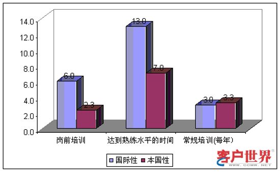 總體看來,印度呼叫中心提供平均為4.1周的崗前培訓(xùn)。其中,國際性呼叫中心平均提供6周崗前培訓(xùn),明顯高于本地性呼叫中心的2.3周。這是因為國際呼叫中心把崗前培訓(xùn)的相當(dāng)一部分時間投入到英語能力的培訓(xùn)和提高上面。此外,參加調(diào)研的呼叫中心主管認(rèn)為,新員工平均在開始工作10周以后才能達到熟練水平。同樣地,我們發(fā)現(xiàn)國際性呼叫中心和本地性呼叫中心在這一指標(biāo)上存在顯著差異。在國際性呼叫中心需要達到熟練水平的時間