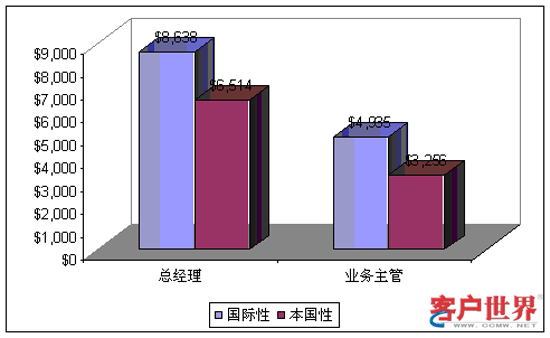 管理人員的薪酬水平明顯高于一線人員的薪酬水平。呼叫中心總經(jīng)理的年收入達到$8,194,其中在國際性呼叫中心為$8,638而在本地性呼叫中心為$6,514。對于業(yè)務(wù)主管來說,平均年工資為$4,253,其中在國際性呼叫中心$4,935而在本地性呼叫中心$3,256。