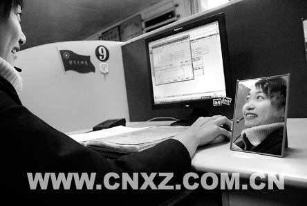 12319服務(wù)熱線中心有13個工作臺,每個工作臺前都有一面鏡子。該中心的負(fù)責(zé)同志說,這面鏡子是檢驗工作人員是否微笑服務(wù)的“晴雨表”。鏡子是今年初安裝的,大家還給它起了一個響亮的名字:“微笑鏡”。