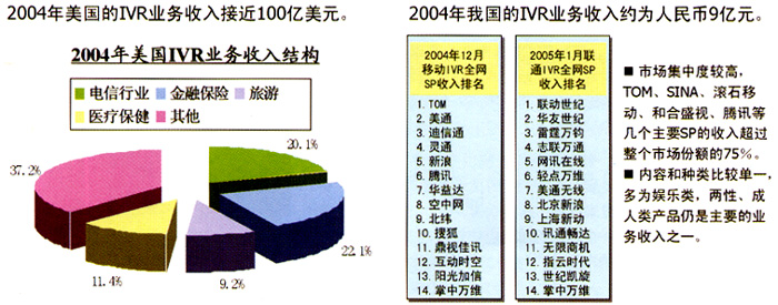 目前,國內(nèi)IVR的業(yè)務主要集中于為個人提供服務上,行業(yè)應用所占比例較小,與成熟的國外市場以行業(yè)應用為主的現(xiàn)狀形成巨大反差。而且,在為個人提供的語音業(yè)務中,國內(nèi)最受歡迎的仍是娛樂信息類中的聊天交友類業(yè)務,這表明國內(nèi)個人用戶的需求層次較低;其次是娛樂和點播類的音樂類業(yè)務;第三大類是游戲答題類,例如:知識競猜、有獎競猜、角色扮演游戲、互動游戲等;另外,IVR的數(shù)據(jù)業(yè)務,如:短信、彩鈴、彩信等,受到近兩年國內(nèi)短信、彩鈴業(yè)務蓬勃發(fā)展的帶動,近兩年也呈現(xiàn)快速增長的良好勢頭。