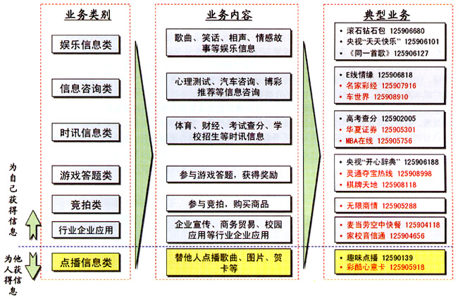 - 時訊信息類和信息咨詢類業(yè)務,IVR優(yōu)勢較強,但業(yè)務范圍較窄,內(nèi)容較少,收入貢獻較低,同時部分業(yè)務容易受到SP信息源的制約。如果能進一步完善服務,滿足用戶需求,業(yè)務將迅速發(fā)展,應該定位于IVR短期發(fā)展的重點業(yè)務。