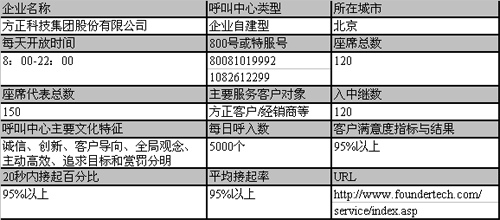 方正呼叫中心是方正服務平臺的重要組成部分,1999年建立,秉承了北大方正“勤備、嚴謹、求實、創(chuàng)新”的精神,依托方正科技“誠信、創(chuàng)新、客戶導向、全局觀念、主動高效、追求目標和賞罰分明”的核心價值觀,以及“全程服務”的品牌文化,以“優(yōu)化服務流程,提高服務質量,培育優(yōu)秀品牌,形成競爭優(yōu)勢,創(chuàng)新服務模式,加速業(yè)務增長”作為自己的發(fā)展目標和方向,并學習業(yè)界先進的理念和方法,不斷探索和發(fā)展,多次受到媒體和機構的關注。