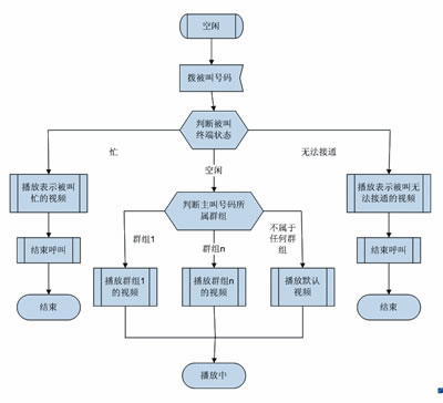 多媒體彩鈴用戶可以為某一位或某一組主叫用戶設定不同的視頻,當某個主叫用戶來電時,系統(tǒng)根據(jù)被叫用戶的狀態(tài)和主叫所屬的群組播放不同的視頻。如果被叫忙或者無法接通,則播放能表達被叫當前狀態(tài)的默認系統(tǒng)視頻;如果被叫空閑,則根據(jù)主叫號碼所屬的群組播放被叫為該群組定制的視頻。無論在哪種情況下,主叫都可以在手機上欣賞到精彩的視頻媒體。圖1是多媒體彩鈴業(yè)務使用流程。