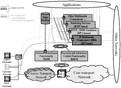 R6中的相關(guān)規(guī)范,但要求支持更多的接入方式,包括xDSL、WLAN、LAN、MAN等。此外,還定義了網(wǎng)絡(luò)附著子系統(tǒng)和資源準(zhǔn)入控制子系統(tǒng)(RACS)。在這樣的框架下,NGN可以實(shí)現(xiàn)基于SIP的業(yè)務(wù)、基于SIP-I協(xié)議傳統(tǒng)業(yè)務(wù)以及基于RTSP的業(yè)務(wù)等。ETSI