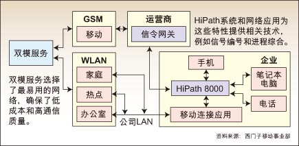 固定/移動(dòng)網(wǎng)絡(luò)融合(FMC)概念已經(jīng)被炒作了兩年之久,其支持者一直都宣稱該技術(shù)可以將手機(jī)和基于室內(nèi)WLAN的無線電話相結(jié)合。今天,供應(yīng)商終于開始部署以特定交換局應(yīng)用為基礎(chǔ)的產(chǎn)品,以及面向手機(jī)的客戶端軟件。西門子移動(dòng)事業(yè)部正在推出針對(duì)統(tǒng)一語音網(wǎng)絡(luò)的Hipath MobileConnect產(chǎn)品,而與此同時(shí),新興企業(yè)Divitas網(wǎng)絡(luò)公司也聲稱,其基礎(chǔ)設(shè)施可以充當(dāng)“移動(dòng)/移動(dòng)融合”的角色。