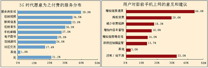 目前用戶對(duì)手機(jī)上網(wǎng)的意見主要集中在速度和資費(fèi)方面,要求增加速度的比例超過了所有用戶的4成,降低資費(fèi)和減少收費(fèi)陷阱的比例分別為29.6%和18.3%。
