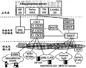 一般IMS分為三層,應用層支持各類應用服務器,負責為用戶提供增值業(yè)務和第三方業(yè)務。會話及呼叫控制層負責管理呼叫或會話設置,其中呼叫會話控制模塊CSCF完成呼叫網關功能、呼叫業(yè)務觸發(fā)功能和路由選擇功能,將SIP信令消息正確地轉發(fā)到應用服務器。歸屬用戶服務器HSS用于維護每個終端用戶獨有的業(yè)務屬性,包括IP地址、漫游信息、好友列表、呼叫業(yè)務定制信息及語音郵件設置等。HSS是全網可用資源。媒體資源功能MRF包括MRFP和MRFC,負責提供及控制媒體流資源,如播放通知音、媒體流的混合、編解碼等。媒體網關控制MGCF負責PSTN承載與IP流之間的連接,根據(jù)被叫號碼和來話情況選擇CSCF,并完成PSTN與IMS之間的呼叫控制協(xié)議轉換,如將從CSCF接收到的SIP消息轉換為MEGACO或ISUP消息,并通過IP發(fā)送到信令網關SGW。出口網關控制功能BGCF主要實現(xiàn)呼叫路由功能,為呼叫選擇適當?shù)腜STN接口點,若發(fā)現(xiàn)該接口點與自己在同一網絡,則選擇本網絡的MGCF與PSTN交互,若發(fā)現(xiàn)接口點在另一網絡時,BGCF將會話信令轉發(fā)給另一網絡相應的BGCF。一個IMS可以包含一個或多個CSCF、HSS、MGCF等功能模塊。傳送及接入層承載各種類型之間的轉換,完成與傳統(tǒng)PSTN/PLMN間的互通等功能,包括各類有線接入、無線接入、互聯(lián)互通網關等設備。