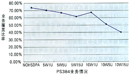 由圖1可知,當(dāng)HSDPA分配功率為5W時(shí),HSDPA對(duì)網(wǎng)絡(luò)覆蓋沒(méi)有很大影響;當(dāng)它為10W時(shí),如果HSDPA用戶數(shù)不大,影響也有限;但是,當(dāng)它為10W時(shí),如果HSDPA用戶數(shù)持續(xù)增加,則會(huì)產(chǎn)生嚴(yán)重影響。在下行從NOHSDPA的74%降低到10W15U的40.62%時(shí),PS384業(yè)務(wù)降低了近一半。同時(shí),隨著業(yè)務(wù)速率的提高,網(wǎng)絡(luò)影響越大。另外,在一定的HSDPA功率分配前提下,隨著HSDPA用戶數(shù)的增加,過(guò)載率增大,網(wǎng)絡(luò)中高速數(shù)據(jù)業(yè)務(wù)的比例隨之減少,各點(diǎn)上的用戶速率不斷降低;同時(shí),用戶的增多使得各小區(qū)的HSDPA發(fā)射功率不斷增大,導(dǎo)致區(qū)域中間各點(diǎn)的終端接收功率普遍增加。