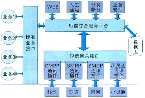 業(yè)務(wù)管理平臺(tái)是為運(yùn)營(yíng)商提供的可快速啟動(dòng)各種數(shù)據(jù)業(yè)務(wù)的平臺(tái),具有強(qiáng)大的資源調(diào)度能力。它連接運(yùn)營(yíng)商的基礎(chǔ)網(wǎng)絡(luò)和業(yè)務(wù)支撐系統(tǒng)(客服系統(tǒng)、計(jì)費(fèi)系統(tǒng)),為服務(wù)提供商/內(nèi)容提供商們提供各種移動(dòng)資源(如短信息中心資源、用戶信息資源、語(yǔ)音資源等)、功能資源(如單點(diǎn)認(rèn)證、計(jì)費(fèi)、漫游控制等)及各種公共的資源引擎(如地理位置、語(yǔ)音交互、推送信息等)。業(yè)務(wù)支撐系統(tǒng)是運(yùn)營(yíng)商為了開展業(yè)務(wù)必須建設(shè)的客服系統(tǒng)、營(yíng)業(yè)系統(tǒng)、計(jì)費(fèi)系統(tǒng)等子系統(tǒng)。圖3是目前常用的綜合短信平臺(tái)[3]。