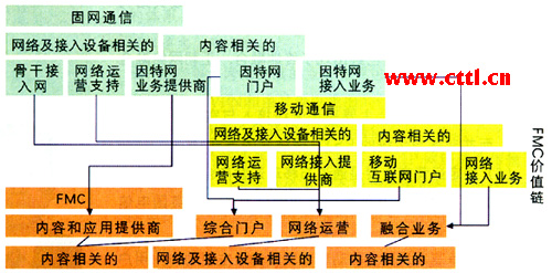 總之,在FMC新配置的價(jià)值鏈中,應(yīng)用和內(nèi)容的作用非常重要,因?yàn)樗麄冊谌诤蠒r(shí)將價(jià)值鏈中的各個(gè)部分連接起來。因此,可以認(rèn)為內(nèi)容和應(yīng)用的建立、積累將會(huì)推動(dòng)增值FMC業(yè)務(wù)的發(fā)展。今后隨著在內(nèi)容和業(yè)務(wù)領(lǐng)域?qū)⒊霈F(xiàn)更多不同的參與者,如內(nèi)容提供商、應(yīng)用提供商和中間件提供商,F(xiàn)MC價(jià)值鏈將進(jìn)一步得到更深層次的合作、擴(kuò)張和合并。這些在新的價(jià)值鏈中出現(xiàn)的更多獨(dú)立但又不同的實(shí)體,將直接反映FMC融合的特征。