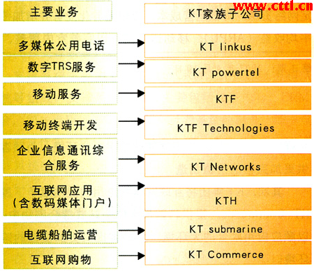 目前,KT集團(tuán)是全業(yè)務(wù)運(yùn)營商,同時(shí)也是韓國最大的固網(wǎng)運(yùn)營商,它在FMC領(lǐng)域最大動(dòng)作就是BcN寬帶融合網(wǎng)絡(luò),這是韓國政府為確保韓國在IT和電信技術(shù)市場持續(xù)領(lǐng)先地位而實(shí)行的IT839計(jì)劃的核心環(huán)節(jié)之一。BcN目的是要將有線與無線系統(tǒng)、通信和廣播系統(tǒng)融合在一起,為企業(yè)用戶和個(gè)人用戶提供一個(gè)共同的渠道收發(fā)語音、文本、圖像和視頻文件。為此,KT集團(tuán)順著新的價(jià)值鏈,對集團(tuán)內(nèi)部分機(jī)構(gòu)的功能進(jìn)行了調(diào)整,其主要組織架構(gòu)如圖2所示: