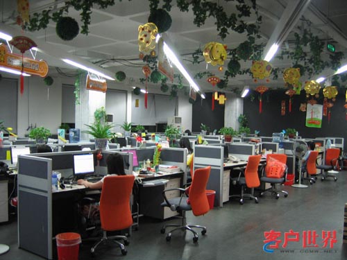 整個服務現(xiàn)場的裝修以桔黃色為主色調,代表溫暖、和諧;格局不規(guī)則化,盡顯現(xiàn)代時尚的風格;辦公室到處是綠色植物,墻上貼滿了各種相片、海報和宣傳語,天花板掛滿了激勵口號板;別具特色的洗手間文化;乒乓球室、休息室、休閑吧,咖啡機、茶葉、果汁、雪糕、飲料,魚缸、大液晶電視、音響……一點感覺不到這是一個枯燥的呼叫中心的工作環(huán)境。