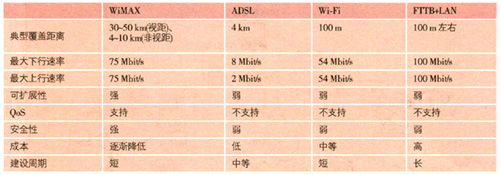 表2 WiMAX與ADSL、Wi-Fi、FTTB+LAN接入方式的比較