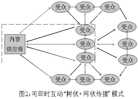 我們認(rèn)為,手機(jī)短信新聞的傳播方式,是“樹狀+網(wǎng)狀傳播”,即由新聞內(nèi)容提供方完成點(diǎn)到面的“樹狀傳播”后,信息接受終端又可以完成一個“網(wǎng)狀傳播”。因此,手機(jī)短信新聞,不僅傳播鏈較長,而且可以相互交錯形成網(wǎng)狀互動,“傳者”和“受者”可以隨時(shí)出現(xiàn)“角色互換”。(見圖2)