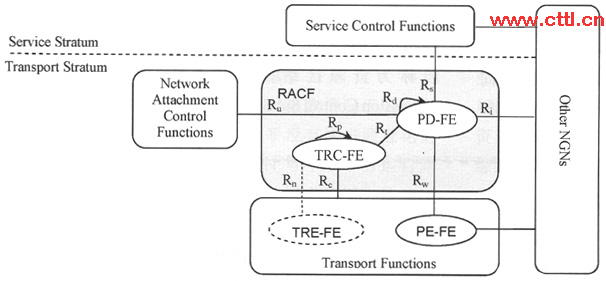 RACF由策略決策功能實(shí)體PD-FE和傳送資源控制功能TRC-FE兩個(gè)功能實(shí)體組成。PD-FE基于網(wǎng)絡(luò)策略規(guī)則、業(yè)務(wù)控制功能SCF提供的業(yè)務(wù)信息、網(wǎng)絡(luò)附著控制功能NACF提供的傳送層簽約信息,以及TRC-FE提供的資源接納決策結(jié)果,做出網(wǎng)絡(luò)資源接納控制的最后決策?梢曰诿總(gè)流對(duì)傳送層的策略執(zhí)行功能實(shí)體。PE-FE下發(fā)資源接納控制策略。TRC-FE負(fù)責(zé)收集和維護(hù)傳送網(wǎng)的拓?fù)浜唾Y源狀態(tài)信息,基于拓?fù)洹⑦B接性、網(wǎng)絡(luò)、節(jié)點(diǎn)資源的可用性以及接入網(wǎng)中的傳送層簽約信息等網(wǎng)絡(luò)信息控制資源的使用,提供傳送網(wǎng)絡(luò)接納控制的決策。PD-FE通過Rt參考點(diǎn)請(qǐng)求TRC-FE檢測(cè)或者決定所請(qǐng)求的媒體流路徑上的QoS資源。