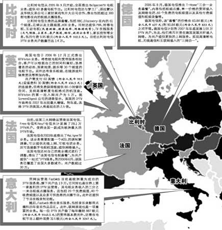 由于缺乏強大的衛(wèi)星網絡轉播、直播系統(tǒng),歐洲人是全球最早進入IPTV時代的地區(qū)。如今,飽受傳統(tǒng)市場萎縮之苦的歐洲電信運營商,希望通過推出“三合一”式的網上音頻、視頻服務,開創(chuàng)全新的盈利局面。據悉,歐洲目前大約有65.8萬IPTV用戶,今年以來已增加66%,預計到今年底,增長率將達到200%;而兩年后,歐洲將有870萬IPTV用戶。