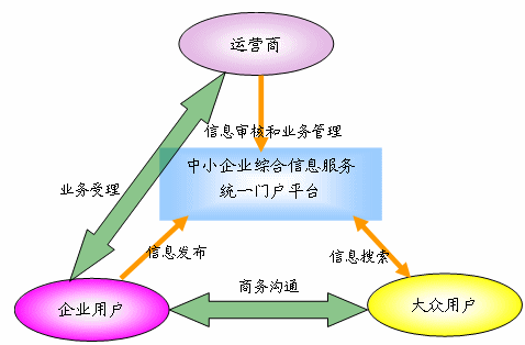 “中小企業(yè)綜合信息服務(wù)統(tǒng)一門戶平臺”的角色包括:運(yùn)營商、企業(yè)用戶、大眾用戶三大角色。各角色與平臺之間及角色之間的業(yè)務(wù)關(guān)系如下: