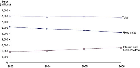 眾所周知,發(fā)達國家固話業(yè)務收益已經(jīng)持續(xù)下降了一段時間了。這與固話同移動話音業(yè)務之間不斷高漲的激烈競爭有很大的關(guān)系。因此為了減弱這種下降趨勢,有線運營商不惜大花血本投資寬帶業(yè)務。圖1的數(shù)據(jù)表明,在某種程度上,有線運營商的這一舉措也取得了成功。數(shù)據(jù)顯示,寬帶的收入是這一成功表現(xiàn)的主要因素。