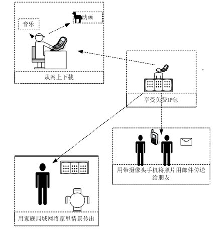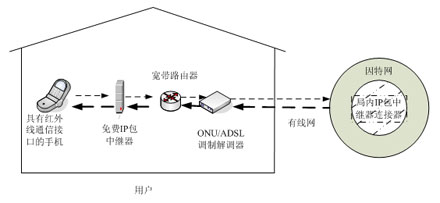 DoCoMo公司網(wǎng)里現(xiàn)有這類(lèi)手機(jī)共37種),通過(guò)無(wú)線方式與免費(fèi)IP包傳輸中繼器相連,免費(fèi)IP包傳輸中繼器通過(guò)以太網(wǎng)經(jīng)過(guò)寬帶路由器或通過(guò)PPPoE(Point