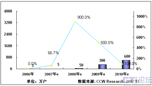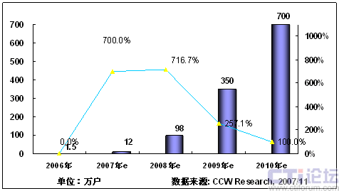 2008年,隨著3G在中國商用,以及奧運帶來豐富視頻內(nèi)容,將推動手機電視作為一項重要的移動增值業(yè)務將進入市場發(fā)展期;同時隨著網(wǎng)絡、終端、內(nèi)容、商業(yè)模式等因素的發(fā)展,產(chǎn)業(yè)鏈初步完善,看好手機電視業(yè)務的產(chǎn)業(yè)鏈各環(huán)節(jié)大力介入,北京奧運會將大大激發(fā)用戶使用手機電視業(yè)務的熱情,從而推動手機電視進入快速發(fā)展階段。根據(jù)計世資訊預計,2008年中國手機電視用戶將達到400萬。