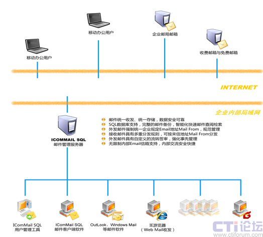 IComMail SQL企業(yè)郵件管理系統(tǒng)是?弟浖瞥龅膬(yōu)秀的郵件管理軟件,自2003年首推自今已有5年的發(fā)展歷史,系統(tǒng)設(shè)計(jì)先進(jìn)、功能獨(dú)特完整、運(yùn)行穩(wěn)定可靠,在國內(nèi)已有大批裝機(jī)用戶,其中以外貿(mào)、進(jìn)出口等外向型企業(yè)為主要用戶群,廣大用戶已經(jīng)獲得了極大的受益。IComMail SQL系統(tǒng)主推的是其強(qiáng)大的郵件管理功能,與通常的郵件服務(wù)器Mail Server系統(tǒng)有著根本的區(qū)別,也有別于日趨流行的企業(yè)郵局服務(wù),IComMail SQL系統(tǒng)是建立在通常的郵件服務(wù)器Mail Server或企業(yè)郵局的應(yīng)用基礎(chǔ)上的,在企業(yè)局域網(wǎng)內(nèi)設(shè)立一IComMail郵件管理服務(wù)器,并采用穩(wěn)定可靠的SQL數(shù)據(jù)庫系統(tǒng)作為支撐,為企業(yè)建立安全可靠的企業(yè)郵件數(shù)據(jù)中心,并在此基礎(chǔ)上,擴(kuò)展了很多高級(jí)的企業(yè)郵件管理功能,使企業(yè)的郵件應(yīng)用水平有質(zhì)的提升。