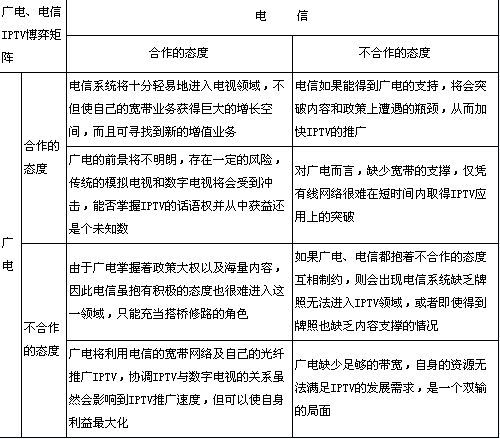電信、廣電雖然都想爭奪IPTV的主導(dǎo)地位,但通過博弈矩陣可以看出,電信和廣電的互相滲透將是打造成熟的IPTV產(chǎn)業(yè)鏈的必然。廣電運營商具有內(nèi)容優(yōu)勢,電信運營商擁有交互技術(shù)和網(wǎng)絡(luò)。廣電網(wǎng)絡(luò)的條塊分割決定了廣電運營商豐富的內(nèi)容資源一旦脫離了電信的IP網(wǎng)絡(luò),就很難抓住IPTV的機會;而電信運營商的網(wǎng)絡(luò)資源沒有內(nèi)容,也會遭遇發(fā)展瓶頸,惟有廣電和電信合作競爭才是IPTV產(chǎn)業(yè)走向健康發(fā)展的現(xiàn)實選擇。
