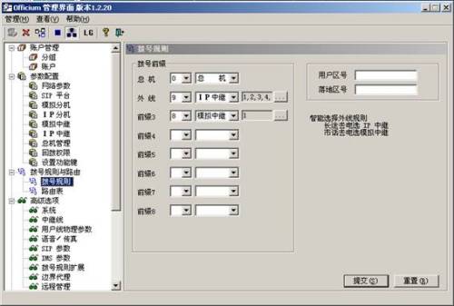 IP PBX 進行配置(如圖)。人機界面簡潔易懂,即便是不懂通訊的外行人,在看過說明書后也能輕松自如地使用。配置起來簡單,例如選擇外線撥號前綴號、做呼叫中心時的ACD輪循分機線路輪循、回撥等,僅僅選下數(shù)字點下提交,幾秒內(nèi)就可配置結束。