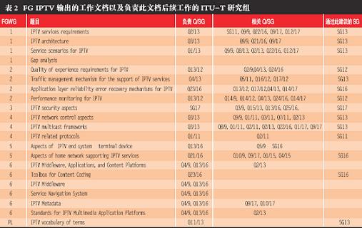 表2 FG IPTV 輸出的工作文檔以及負(fù)責(zé)此文檔后續(xù)工作的ITU-T