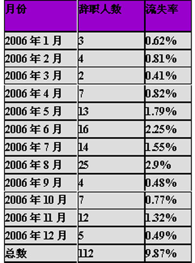 在進(jìn)行收集、分析一些客服中心資料的過程中,與相關(guān)領(lǐng)導(dǎo)人員進(jìn)行較深入的思想碰撞,尤其是與中國移動(dòng)江蘇省客服中心副總經(jīng)理張立春的交流,尤為深刻。一組數(shù)據(jù)深深的震撼著我的思想,一是離職率2006年,僅為:9.87%,遠(yuǎn)遠(yuǎn)好于整個(gè)行業(yè)的平均水平;二是員工的心理健康和壓力狀況遠(yuǎn)遠(yuǎn)好于全國的平均水平;三是客戶服務(wù)質(zhì)量保持行業(yè)領(lǐng)先地位,各項(xiàng)指標(biāo)具體數(shù)值陳述如下。