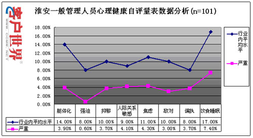 目前,員工壓力和心理健康情況已成為困擾整個(gè)行業(yè)的主要問題之一,我們通過專業(yè)方法對(duì)淮安中心的員工心理健康和壓力狀況進(jìn)行了科學(xué)的測量,以了解該中心員工的壓力和心理健康狀況,具體測量數(shù)據(jù)如下: