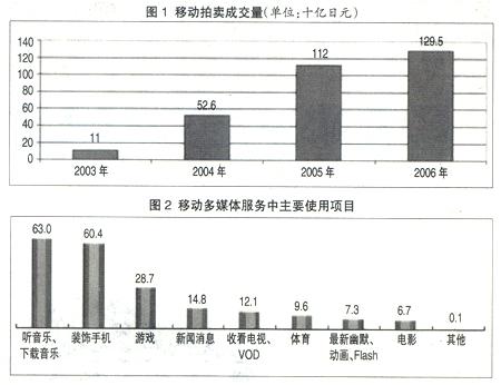 日本的在線購物和拍賣市場起步較晚,但發(fā)展速度較快,用戶的認知度也比較高,有41%~48%的移動互聯(lián)網(wǎng)用戶使用過該項業(yè)務。十幾歲到二十幾歲的女性較傾向于使用該業(yè)務。2006年移動拍賣的成交量為1295億日元,占到了通過手機在線購買成交量的1/2(見圖1)。