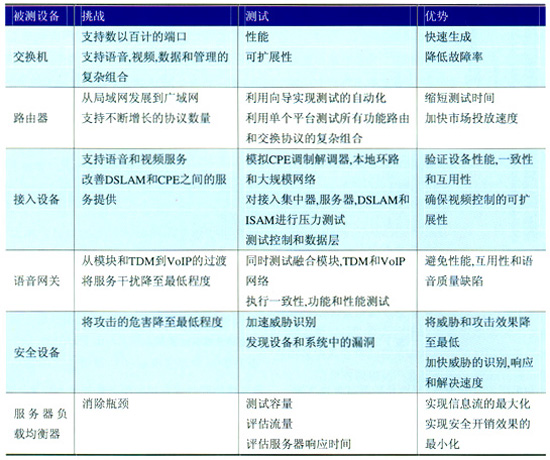 此外,思博倫還可以提供安全風險管理解決方案。服務商和網(wǎng)絡設備制造商可以生成真實的流量,并將其引入網(wǎng)絡中,然后監(jiān)視各種“惡意代碼”對單個設備和總體網(wǎng)絡性能造成的影響,從而對網(wǎng)絡和設備中可能存在的漏洞進行周全的測試。表1為思博倫基礎(chǔ)設施測試的挑戰(zhàn)和優(yōu)勢。