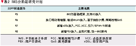 3GPP依照UMTS 3G移動(dòng)通信系統(tǒng)的系列標(biāo)準(zhǔn)版本定義了IMS的分階段演進(jìn)計(jì)劃[5],如表2所示。其中,2002年完成的R5是第一個(gè)全I(xiàn)P移動(dòng)網(wǎng)絡(luò)標(biāo)準(zhǔn),它將核心網(wǎng)歸為一個(gè)統(tǒng)一的基于IP的分組(PS)域,具有服務(wù)質(zhì)量(QoS)保證,能夠提供各種類(lèi)型的多媒體增值業(yè)務(wù),其核心技術(shù)標(biāo)準(zhǔn)就是IMS。R6進(jìn)一步完善IMS接口和功能,增加對(duì)于WLAN的接入支持,并研究IMS域的計(jì)費(fèi)和QoS控制技術(shù)。R7融合TISPAN關(guān)于NGN的研究標(biāo)準(zhǔn),增加對(duì)于xDSL接入技術(shù)的支持,提出策略控制與計(jì)費(fèi)(PCC)技術(shù)以及WLAN/3G語(yǔ)音連續(xù)通信的話(huà)音連接連續(xù)(VCC)技術(shù)。正在研究中的R8將協(xié)同各個(gè)標(biāo)準(zhǔn)化組織的工作,研究支持組合業(yè)務(wù)的業(yè)務(wù)代理技術(shù)以及下一步的統(tǒng)一IMS架構(gòu)。