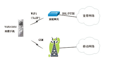WiFi/GSM雙模手機(jī)既可以接入無線局域網(wǎng)WLAN,實(shí)現(xiàn)VoIP(VoiceoverIP)功能,又可以接入蜂窩網(wǎng),實(shí)現(xiàn)移動通信功能。但傳統(tǒng)的WiFi/GSM雙模手機(jī)在進(jìn)行WiFi網(wǎng)絡(luò)和GSM網(wǎng)絡(luò)之間的切換時,無法實(shí)現(xiàn)無縫切換,用戶體驗(yàn)比較差,因此前幾年這種雙模終端發(fā)展得并不理想。