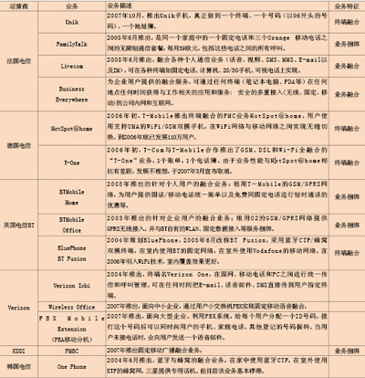 從全球范圍來看,大多數(shù)重要的固定運(yùn)營商、移動運(yùn)營商和綜合性運(yùn)營商都已經(jīng)開始或計(jì)劃提供各種形式FMC業(yè)務(wù)(見表)。其中大多數(shù)運(yùn)營商提供捆綁業(yè)務(wù)和簡單的融合業(yè)務(wù),而歐美的一些頂尖運(yùn)營商已推出基于融合終端的FMC業(yè)務(wù)。