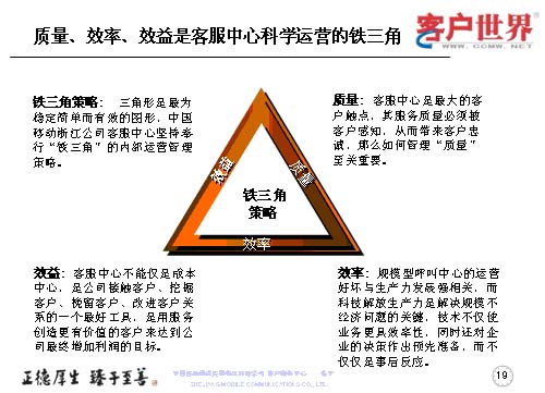 應(yīng)該說這三個(gè)方面是科學(xué)運(yùn)營的一個(gè)鐵三角,這是我們的理解,因?yàn)槿切,始終認(rèn)為是最穩(wěn)定、簡單、有效的圖形,也是我們?cè)谶M(jìn)行內(nèi)部運(yùn)營的管理鐵架。質(zhì)量是客服中心最大的觸點(diǎn)當(dāng)中被客戶感知,從而帶來客戶忠誠的,如何管理質(zhì)量,那就至關(guān)重要。效率尤其是規(guī)模型的呼叫中心的運(yùn)營好壞,是與生產(chǎn)力的發(fā)展強(qiáng)相關(guān),而科技解放生產(chǎn)力是解決規(guī)模問題的關(guān)鍵。技術(shù)不僅是運(yùn)行更具效益率,同時(shí)還對(duì)企業(yè)的決策作出預(yù)先準(zhǔn)備,而不僅僅是事后反應(yīng)。很多年來,更多的企業(yè)是把客服中心視為成本中心,而事實(shí)上,效益的顯現(xiàn)讓我們陸續(xù)地走出了成本中心,它應(yīng)該是公司接觸客戶、挖掘客戶、挽留客戶、改進(jìn)客戶關(guān)系的一個(gè)最好工具,是用服務(wù)創(chuàng)造更有價(jià)值的客戶,來達(dá)到公司最終增加利潤的目標(biāo)。